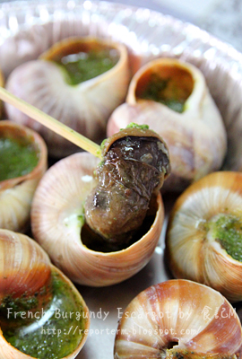 法國蝸牛是法國菜中很有名的菜式,法國人亦叫蝸牛為田螺,當中以布根地(Burgundy)出品的可食用蝸牛最為馳名。這盤在city'super買到的法國布根地蝸牛一盤12隻,屬於Helix Lucorum品種,螺層數目較多,殼質厚實。殼的空隙已填滿香草蒜蓉牛油,從雪櫃取出直接放入已預熱的焗爐焗10分鐘即可,非常方便。(這次我把焗爐調校至攝氏170度)